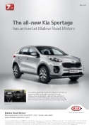 The all-new Kia Sportagehas arrived at Mallow Road MotorsSat Nav with Tom Tom services standard on EX and GSE modelsMallow Road MotorsThe eagerly awaited all-new Kia Sportage has arrived in our showroom. With an attractive new exterior design, enhanced ride and handling, significant improvements to performance and fuel efficiency and improved technology the Sportage has all you need to get you through a busy life.kia.comBlarney Business Park (near NCT), Cork Tel 021 439 2066 www.mallowroadmotors.comFuel consumption figures in l/100km for the Kia Sportage range are: Urban 5.4 – 7.0, Extra Urban 4.2 – 5.2, Combined 4.6 – 5.9. The official CO2 emissions for the Kia Sportage are between 154 – 119 g/km. Warranty is 7 years/150,000km full warranty. Terms and conditions available in warranty and service handbook. Model shown may not be to Irish specification. Detailed Irish specifications can be found on our website. Please check with your dealer that your chosen model has your required specification. All prices quoted are manufacturers recommended retail prices and do not include metallic paint, delivery and related charges. www.kia.com