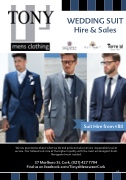 WEDDING SUIT Hire & SalesSuit Hire from €80We are passionate about what we do and pride ourselves on our impeccable level of service. Our tailored suits are of the highest quality with the most extravagant finish. No appointment needed.37 Marlboro St, Cork. (021) 427 7794 Find us on facebook.com/TonysMenswearCork63